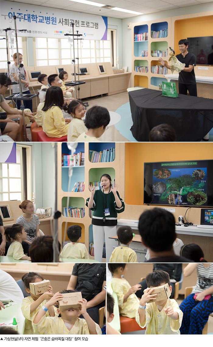 6층 소아병동 학습실에서 열린 이번 행사에서는 용인 지역 전통 설화를 바탕으로 제작한 인형극 ‘감투 쓰고 소가 된 농부’와 구글 익스피디션 기술을 활용한 가상현실(VR) 자연 체험 ‘곤충은 숨바꼭질 대장’을 진행해 투병 생활로 문화 향유 기회가 적은 환아와 보호자에게 큰 즐거움을 선사했다.