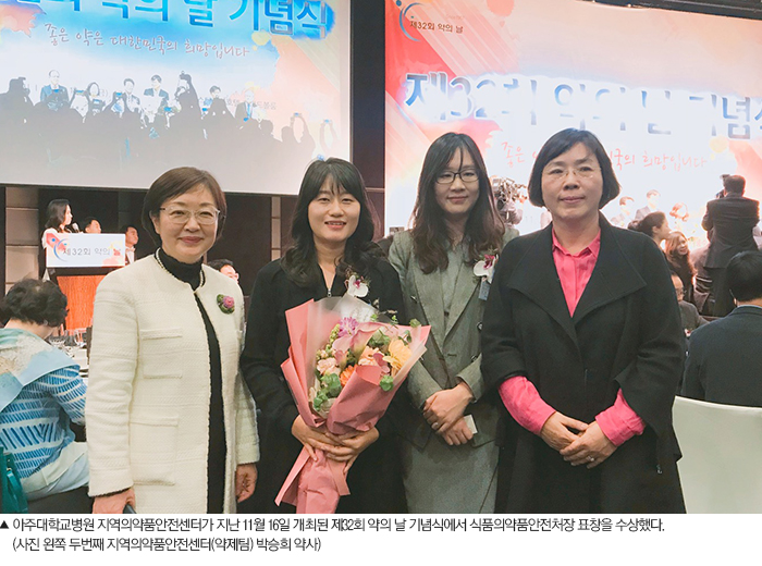 아주대학교병원 지역의약품안전센터가 지난 11월 16일 서울 웨스턴 조선호텔에서 개최된 제32회 약의 날 기념식에서 식품의약품안전처장 표창을 수상했다.